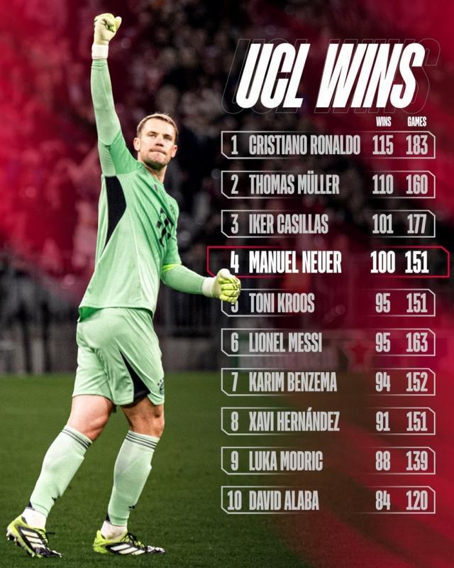 拜仁官方晒欧冠胜场榜:诺伊尔100胜列第4 能否超越C罗