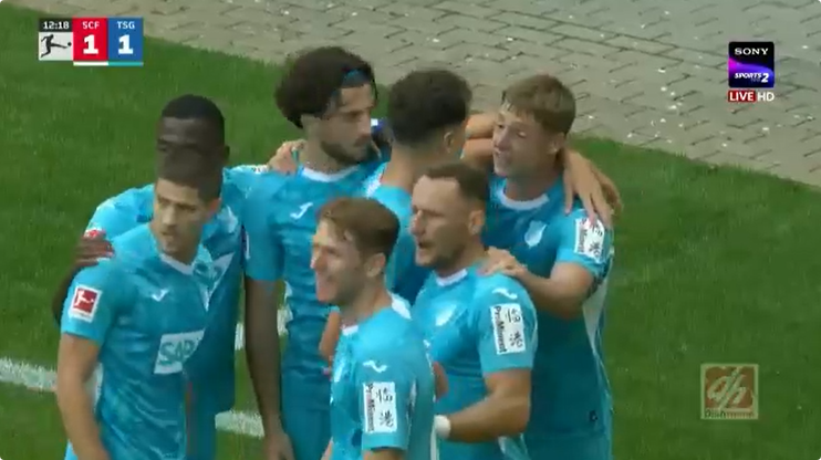 第13分钟,霍芬海姆球员曹法尔助攻阿斯拉尼打入一球。