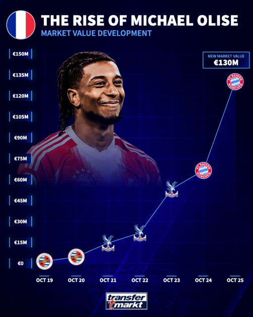 奥利塞转会拜仁的时候,他的德转市场价值为5500万欧,而在那之后,他目前已经成长到了1.3亿欧的高度,跻身世界前10,换句话说,奥利塞在拜仁效力期间,身价暴涨了足足7500万欧——其中仅在今年,奥利塞的市值就增加了6500万欧,在2025年里,没有哪位球员的身价涨幅能够超过他。
