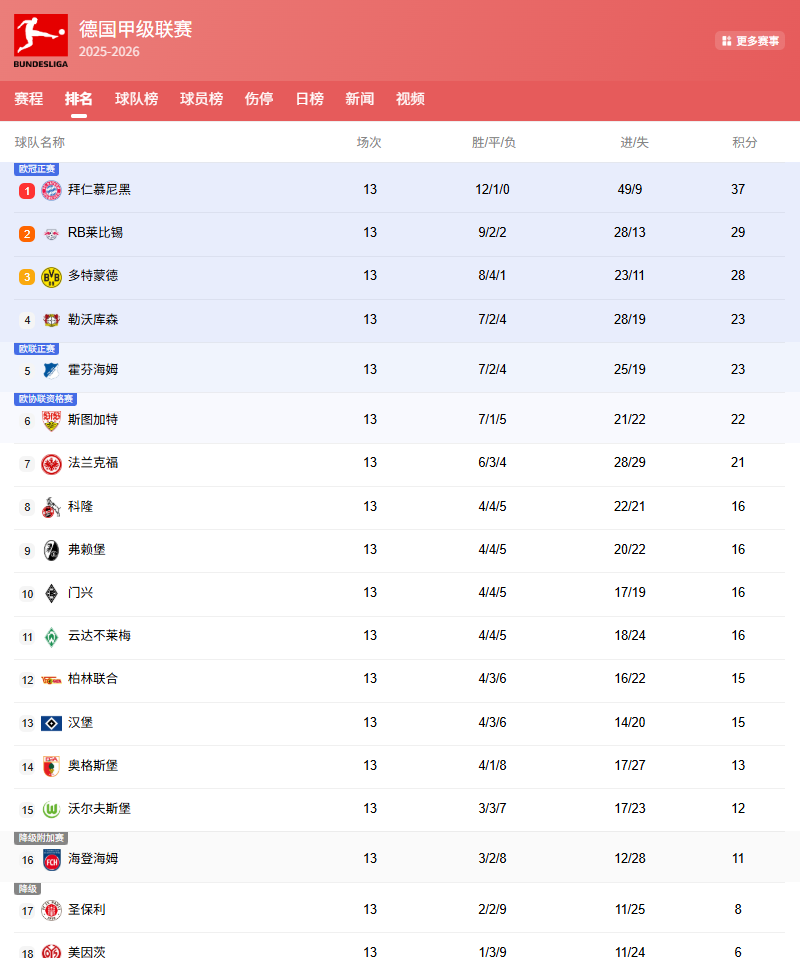 积分榜方面,13轮战罢,拜仁12胜1平0负遥遥领先,比第2名的莱比锡多了8分之多。多特今天赢球后,近6轮4胜2平保持不败,落后莱比锡1分,少拜仁9分,比第4的勒沃库森多5分,前3还是很稳的。霍芬海姆输球后,还是净胜球劣势排在勒沃库森之后位列第5。