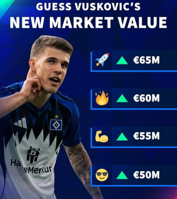 北京时间3月17日,德转预热了托特纳姆热刺外租汉堡的年轻中卫卢卡-武什科维奇的身价更新,他们给出了四个上涨选项,最高涨至6500万欧元。