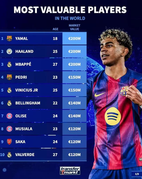 最新!德转更新球员身价榜:亚马尔3人2亿领衔