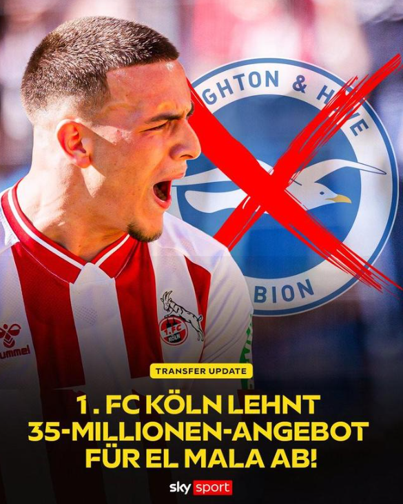 根据德国天空体育的最新消息,科隆拒绝了布莱顿对马拉开出的3500万欧元报价,俱乐部已为这名19岁小将定下5000万欧元的标价。