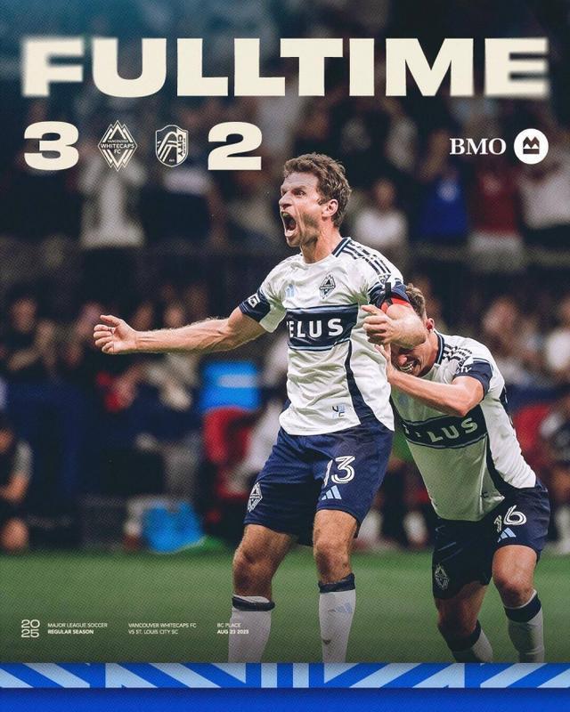 比赛最后的伤停补时阶段第14分钟,温哥华球员拉沃尔达离谱倒地,自己绊倒自己,但是裁判在观看VAR之后,判罚点球。穆勒点射读秒绝杀,收获美职联首球!温哥华3-2绝杀圣路易斯城。