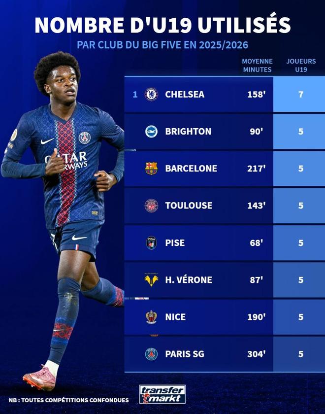 五大联赛U19球员切尔西使用人数最多,巴黎出场时间最多