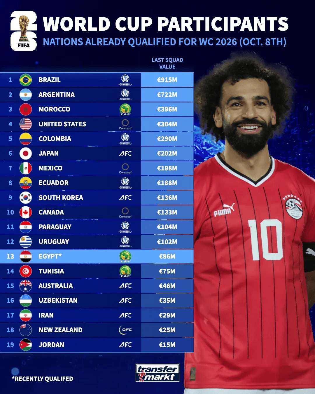 北京时间10月9日消息,随着埃及提前一轮从世预赛非洲区出线,已经有三支非洲球队锁定了明年美加墨的世界杯席位,共19队已经确定晋级2026世界杯正赛。根据德国转会市场的最新数据,在已经确定晋级世界杯的19队中,巴西国家队总身价居首,卫冕冠军阿根廷排在第二,日本第6,韩国第9。