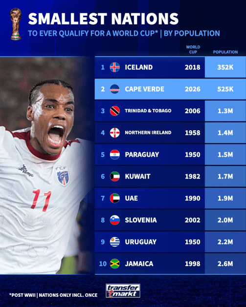 20多年过去了,佛得角在世界杯再度迎来扩军后,终于有幸成为了世界杯48支参赛队伍中的一支。值得一提的是,他们在世界杯“smallest”的排行榜上也是赫赫有名,成为了二战以来,第二小的正赛参赛国。