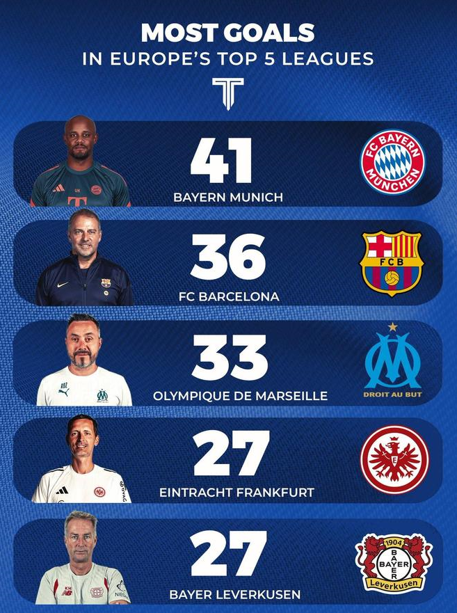 北京时间11月24日,The Touchline统计出了本赛季至今欧洲五大联赛进球最多的五支球队,三支德甲球队入围,11轮德甲狂轰41球的拜仁慕尼黑领跑,巴塞罗那13轮西甲打进36球排名第二。