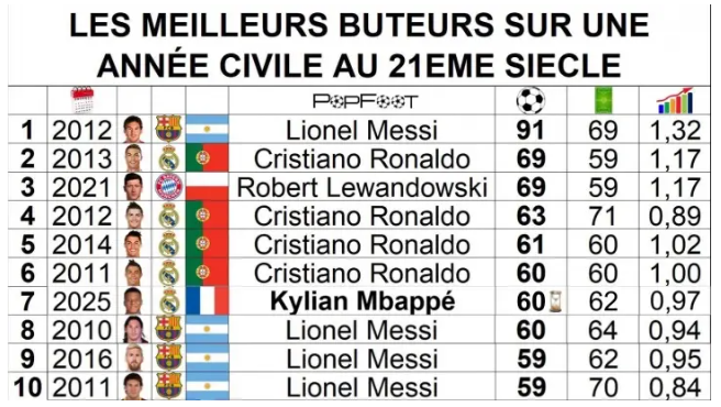 2025年进入12月份,皇马/法国前锋姆巴佩在这一自然年中已经打入了60粒进球,在21世纪的自然年进球总榜中目前排名并列第六,与C罗在2011年和梅西在2010年的数据相同。