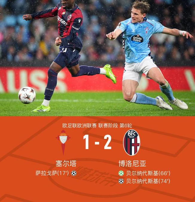 北京时间12月12日,欧足联欧洲联赛联赛阶段第六轮展开较量,塞尔塔迎战博洛尼亚。上半场,斯韦德贝里送出助攻,萨拉戈萨破门得分,为球队取得领先。下半场,贝尔纳代斯基主罚点球命中,帮助博洛尼亚扳平比分。比赛后段,坎比亚吉助攻贝尔纳代斯基再入一球,完成个人本场比赛的第二粒进球。最终,博洛尼亚客场2-1逆转塞尔塔。