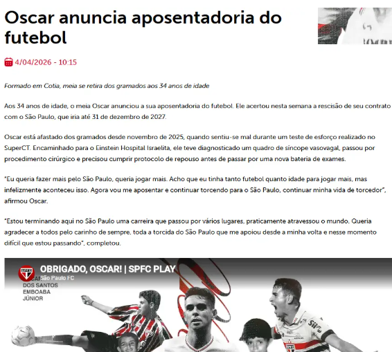 “我本想为圣保罗做更多贡献,我想踢更多比赛。我认为我既有能力也有足够的年龄继续踢下去,但很遗憾,事情就是这样发生了。现在我要退役了,但我将继续支持圣保罗,继续我的球迷生涯,”奥斯卡说道。