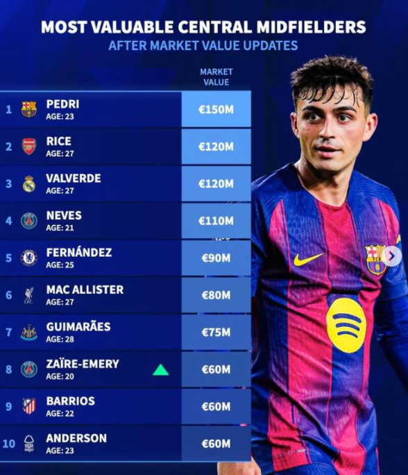 德转列中前卫身价前10:佩德里1.5亿欧第1,赖斯第2