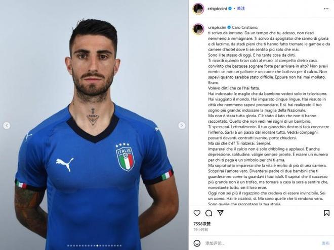 “今天对我来说不是一个普通的日子。今天我将结束一个标志着我一生的篇章:足球。”皮奇尼在他的Instagram账号上写道。在他宣布退役后不久,瓦伦西亚回应道:“你是我们的一员,祝你在新的阶段一切顺利。”