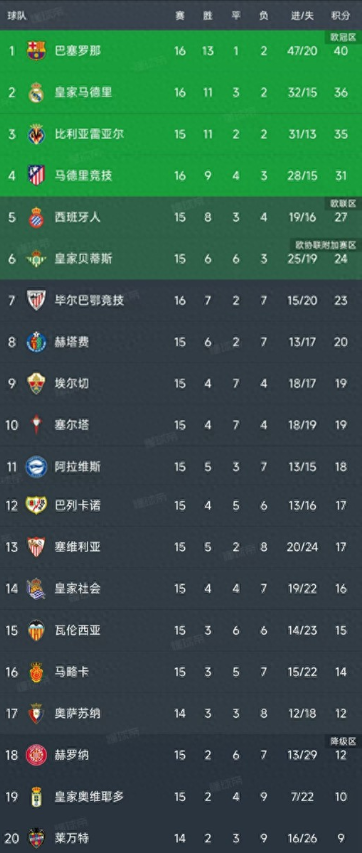 在今日凌晨的西甲第15轮赛事中,多支劲旅展开激烈角逐,比赛结束后,最新的积分榜也随之更新,让我们一起来详细了解当前的联赛态势。首先,比利亚雷亚尔坐镇主场,以2-0击败赫塔费,展现了稳健的攻防能力。紧接着,阿拉维斯在主场以1-0小胜皇家社会,拿下关键3分。最引人关注的当属巴塞罗那客场迎战皇家贝蒂斯的精彩对决,最终以5-3高比分取胜,彰显了他们强大的进攻火力。此外,毕尔巴鄂竞技凭借主场优势,以1-0战胜马竞,这场比赛的结果让积分榜发生了不小的变化。