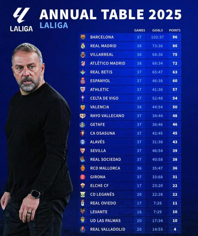 北京时间12月28日,德转统计出了2025年西甲联赛的积分榜,巴塞罗那以96分高居第一,皇家马德里86分第二,比利亚雷亚尔75分第三,马德里竞技72分排名第四。