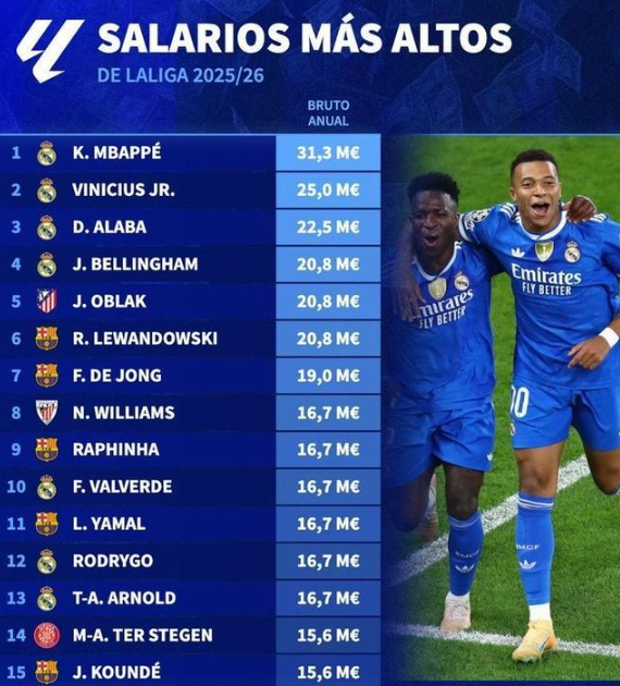 西甲球员年薪榜:姆巴佩3130万欧居首,皇马包揽前四