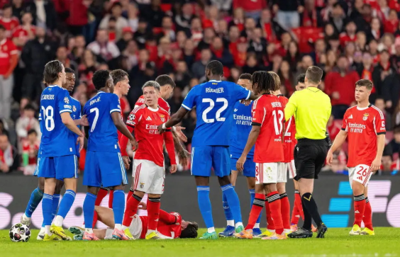 伤停补时阶段,本菲卡球迷将打火机扔如球场内,楚阿梅尼捡到后交给主裁判拿出场外。读秒阶段,维尼修斯主罚角球时,手臂被球迷扔下来的水瓶击中。