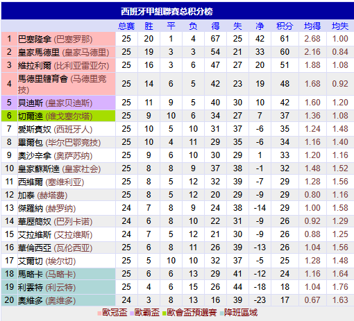 积分榜方面,巴萨今天大胜止住颓势后,皇马就真的只在榜首开心了一周,惨遭榜首一轮游,巴萨1分的优势超过皇马夺回榜首。比利亚雷亚尔今天赢球,多马竞3分,稳住第3的位置。