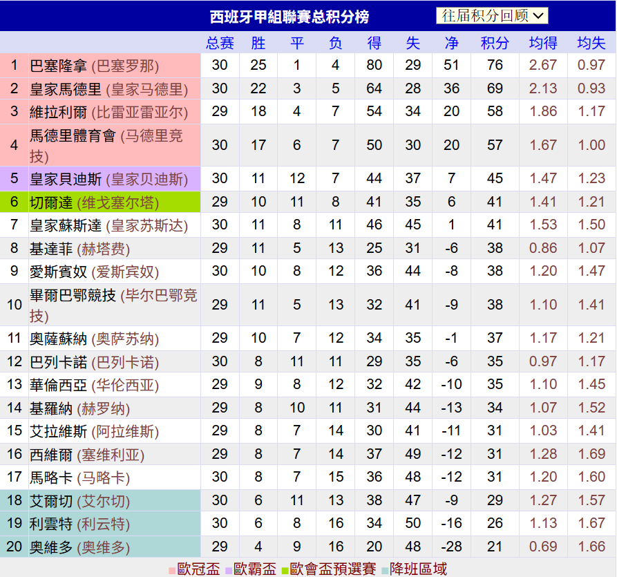 相比之下,保级大战的残酷性有增无减。阿拉维斯(29轮)、塞维利亚(29轮)与马略卡(30轮)同积31分,仅以微弱优势脱离降级区。而埃尔切(30轮29分)、莱万特(30轮26分)和皇家奥维耶多(29轮积21分)则深陷降级区。