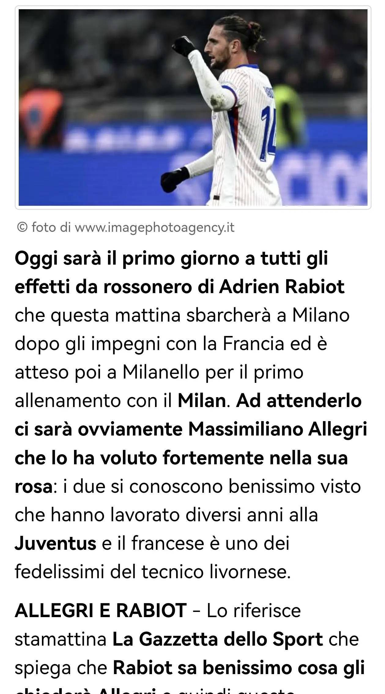 今日将是阿德里安·拉比奥特正式以AC米兰球员身份开启的第一天——这位法国中场在完成国家队赛事任务后,于今日上午抵达米兰,随后将前往米兰内洛,参加他加盟米兰后的首堂训练课。
