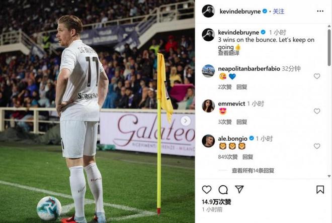 德布劳内写道“:连胜3场!让我们继续加油”