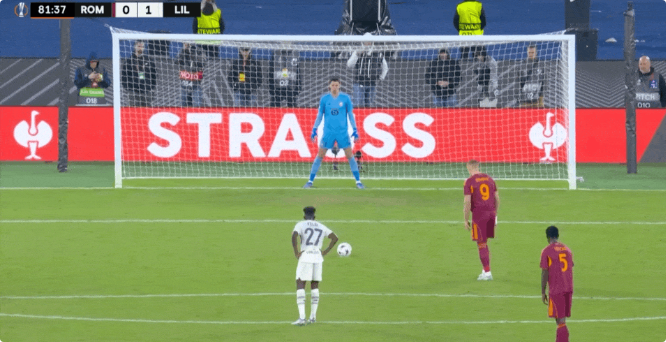 第一个站上点球点的是多夫比克。他的射门角度太正又绵软无力,被里尔门将奥兹尔轻松扑出。不过由于门将提前移动,双脚都离开了门线,罗马因此获得了第二次重罚的机会。