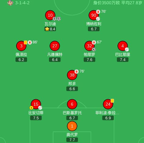 第35分钟,克雷莫内塞球员博纳佐利助攻瓦尔迪打入一球。