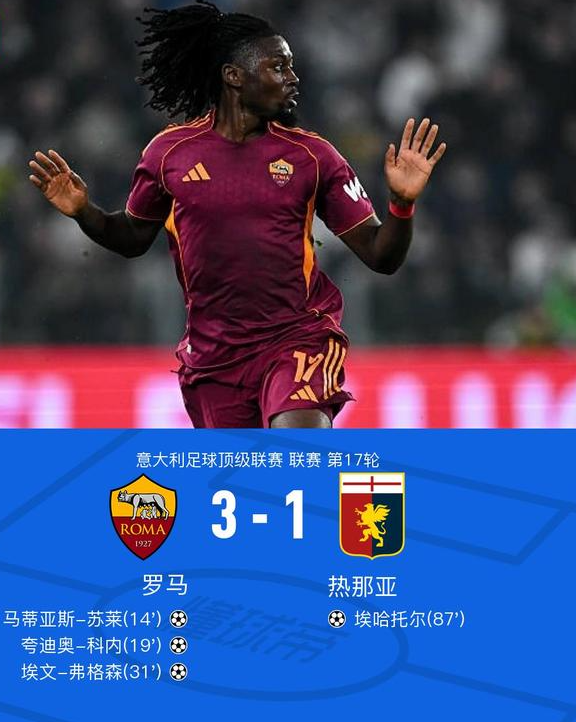 北京时间12月30日,意大利足球顶级联赛第17轮,罗马坐镇主场迎战热那亚。比赛中,马蒂亚斯-苏莱率先打破僵局,为罗马取得领先。随后埃文-弗格森送出助攻,帮助夸迪奥-科内破门扩大比分。不久之后,埃文-弗格森接应进攻再度建功,将优势进一步巩固。直至比赛末段,热那亚由埃哈托尔攻入一球,挽回些许颜面。最终全场比赛结束,罗马以3比1战胜热那亚。