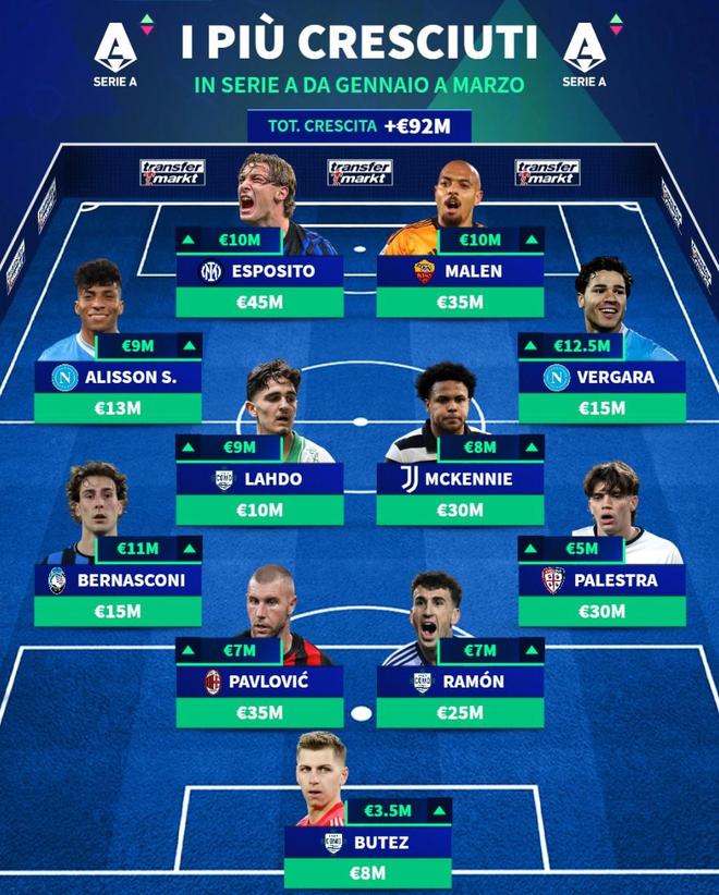 北京时间3月29日,在更新了意甲球员的身价之后,德转列出了此次更新身价上涨最佳11人阵容,皮奥-埃斯波西托领衔,马伦、麦肯尼、帕夫洛维奇在列。