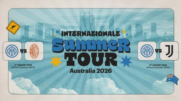 国米官方发布的公告确认,今夏他们将会首次前往澳大利亚,并在珀斯的Optus体育场与米兰和尤文进行两场友谊赛,比赛的时间分别是8月5日(对阵米兰)和8月8日(对阵尤文)。