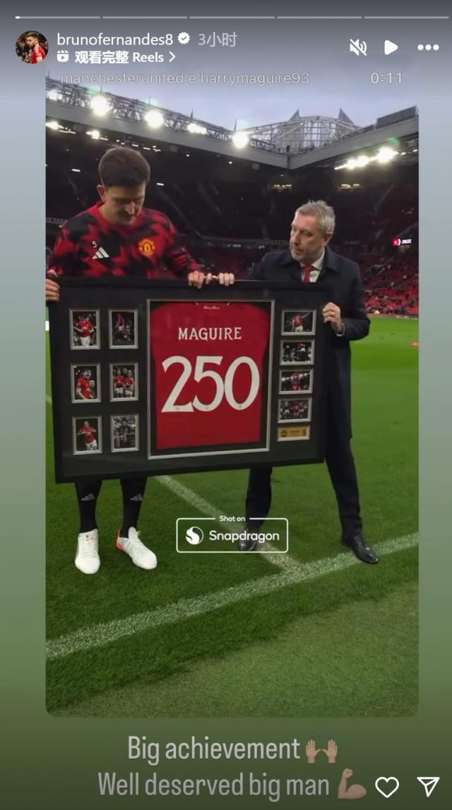 此役是马奎尔为曼联出战的第250场比赛,B费社媒晒出马奎尔领取纪念球衣的视频,配文:“重大成就,当之无愧,大个子。”