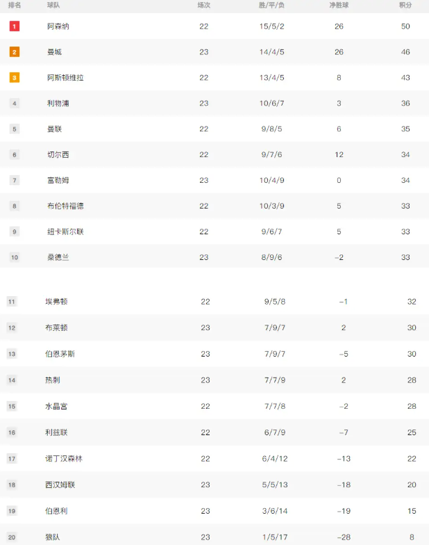 北京时间1月25日消息,2025-26赛季英超第23轮,曼城2-0狼队结束各项赛事的连败,先赛一场的情况下落后榜首阿森纳4分。利物浦2-3遭伯恩茅斯读秒绝杀,暂时排在积分榜第四位,领先少赛一场、排在第五位的曼联1分,领先排在第六的切尔西2分。