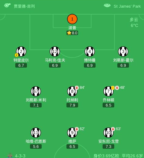 第19分钟,布恩迪亚远射破门,维拉客场1-0领先纽卡