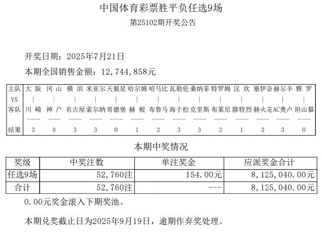 北京时间7月21日,胜负彩第25102期任九开奖结果揭晓。本期任九开出52,760注,单注奖金154元。本期任九投注总额为12,744,858元。