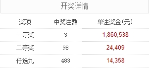 25096期开奖结果:一等奖仅3注 单注奖金高达186万多元
