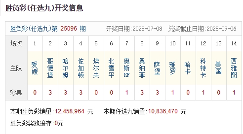 北京时间7月8日,足彩25096期开奖。本期全国中出一等奖3注,每注奖金1,860,538元,二等奖中出98注,每注奖金24,409元。另外,任选9场中出483注,每注奖金14,358元。