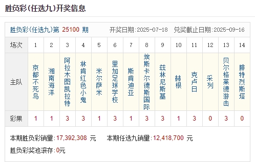 - 足彩25110期开奖结果:一等奖18注 单注奖金41.7万 (2025/08/12 10:41)