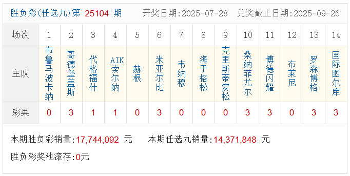 本期足彩销量17,744,092元,本期任选九销量14,371,848元,开奖结束后,足彩奖池滚存0元。