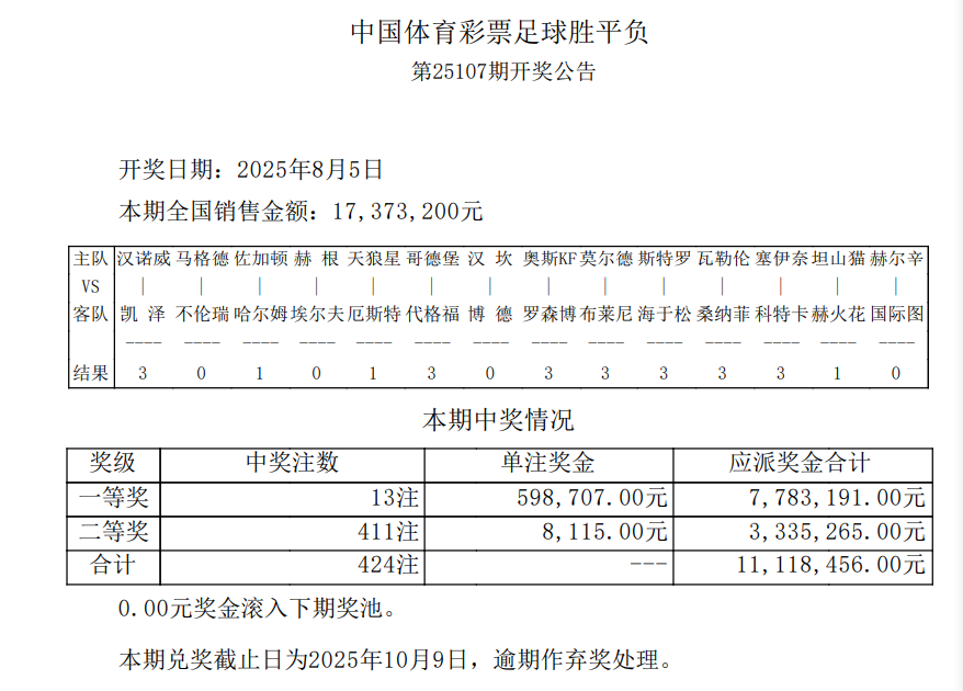 北京时间8月5日,足彩25107期开奖。本期全国中出一等奖13注,每注奖金598,707元,二等奖中出411注,每注奖金8,115元。另外,任选9场中出1794注,每注奖金4,852元。
