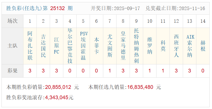 足彩25132期开奖结果:一等奖1注 单注奖金500万元