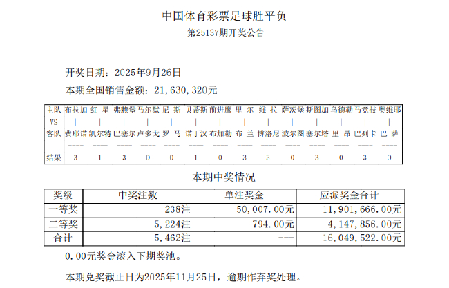 足彩25137期开奖结果:头奖开238注50007元 奖池被清空