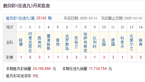 北京时间10月11日,足彩25142期开奖。本期全国中出一等奖38注,每注奖金284,950元,二等奖中出1050注,每注奖金4,419元。另外,任选9场中出11129注,每注奖金674元。