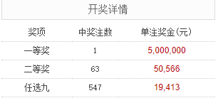 北京时间11月7日,足彩25162期开奖。本期全国中出一等奖1注,每注奖金5,000,000元,二等奖中出63注,每注奖金50,566元。另外,任选9场中出547注,每注奖金19,413元。