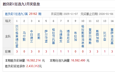 足彩25162期开奖结果:一等奖1注 单注奖金500万元