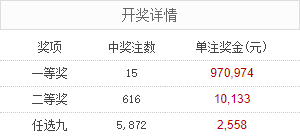 北京时间11月9日,足彩25164期开奖。本期全国中出一等奖15注,每注奖金970,974元,二等奖中出616注,每注奖金10,133元。另外,任选9场中出5,872注,每注奖金2,558元。