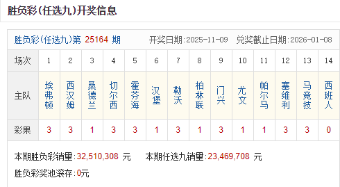 本期足彩销量32,510,308元,本期任选九销量23,469,708元,开奖结束后,足彩奖池滚存0元。