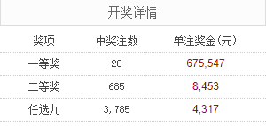 北京时间11月23日,足彩25169期开奖。本期全国中出一等奖20注,每注奖金675,547元,二等奖中出685注,每注奖金8,453元。另外,任选9场中出3785注,每注奖金4,317元。