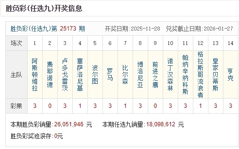 足彩25173期开奖结果:一等奖159注 单注奖金7.3万元