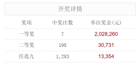 足彩25176期开奖结果:一等奖7注 单注奖金202万元