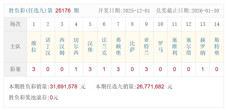 北京时间12月1日,足彩25176期开奖。本期全国中出一等奖7注,每注奖金2,028,260元,二等奖中出198注,每注奖金30,731元。另外,任选9场中出1,283注,每注奖金13,354元。